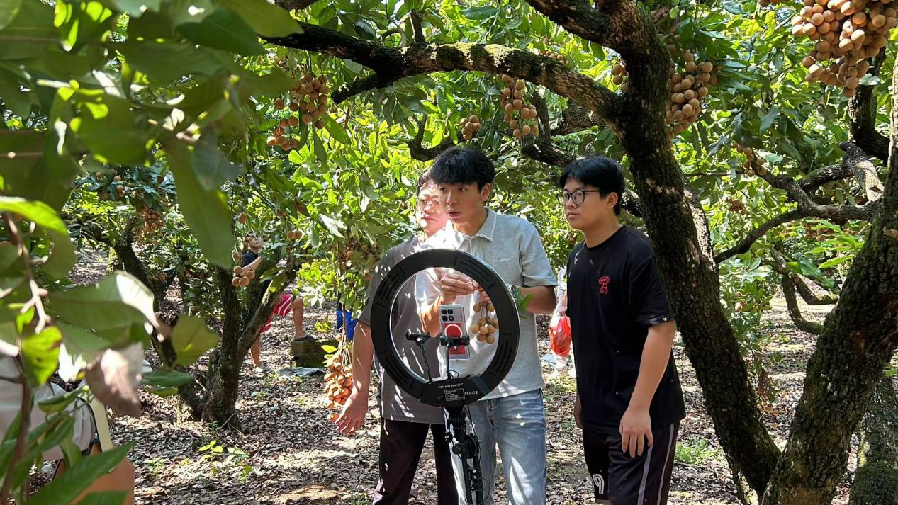作为经济管理学院的特色专业力量,电子商务和网络营销与直播电商教研室的教师们将课堂搬到了龙眼园。“这正是检验我们直播课程教学成果的最佳实践场。” 带队教研室主任李娟说道。在师生们临时搭建的“农场”直播间,学生们轮番上阵担任主播,从龙眼的生长环境、口感特点到营养价值进行细致讲解,还通过现场采摘、试吃等环节增强互动感。直播间里,网友们的下单热情高涨,“助农直播必须支持”“看着就新鲜,已经下单” 等评论不断刷屏。经过几个小时的连续直播,滞销的龙眼被全部售罄,为农户解了燃眉之急,成为经济管理学院 “理论 + 实践” 教学模式的生动印证。
