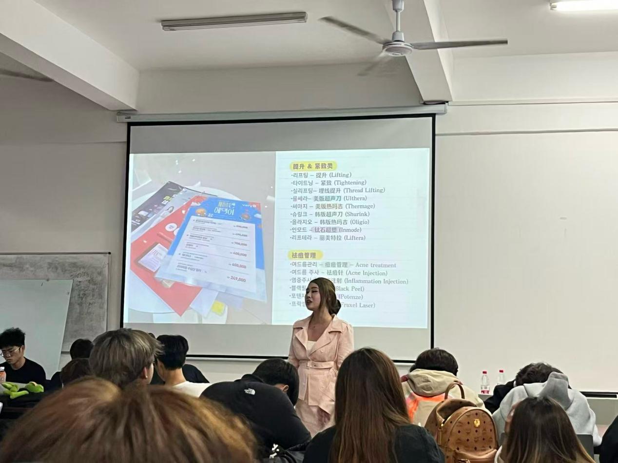 我院饶昕月老师的分享干货与亮点兼具。教育体系方面,她详解韩国大学自主选课制、“发表式教学”的核心逻辑,结合自身经历举例。饶老师留学时参与“品牌营销策划”,有机会参与明星直播策划运营、美妆品牌宣传等媒体项目,从脚本撰写、现场协调到与艺人团队对接,把课堂知识直接转化为实战能力。这些与媒体、明星相关的实践经历,不仅提升了跨文化沟通与应急处理能力,更让自己在审美上实现质的飞跃,都形成了自己的美学逻辑,这对财经商贸类专业的项目展示、品牌推广工作格外加分。
